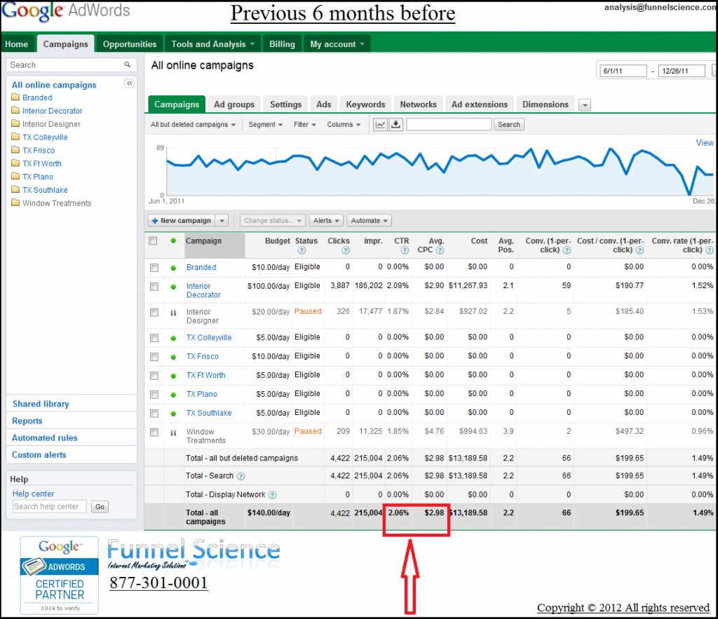 On December 27, 2011 Funnel Science completed the analytics audit and began to optimize the clients Adwords Campaign. After the first 7 days